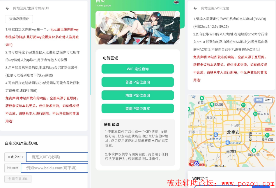 使用本软件可以生成一个链接,发送给好友,好友点击链接,就能获取好友的IP地址,然后使用该IP地址就能查询出它的真实位置。