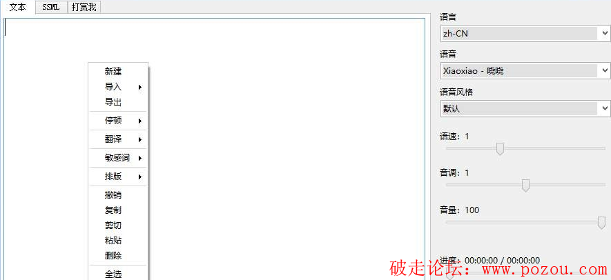 软件功能:导入TXT文件,导入SRT字幕文件,保存导出编辑内容,支持停顿,自定义停顿时间,试听,局部试听,翻译,局部翻译,自动排版,自动标点,文本替换,敏感词提醒,敏感词替换,SSML多人语音混编等功能。